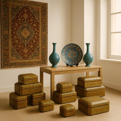 From handwoven carpets and Minakari enamel work to Khatamkari marquetry, Ghalamzani metal engraving, and Firouzeh Koobi turquoise inlay, every piece we curate reflects centuries of heritage while speaking to modern sensibilities. Our mission is to make authentic Persian artistry accessible worldwide, celebrating the skill of master artisans and empowering their communities.