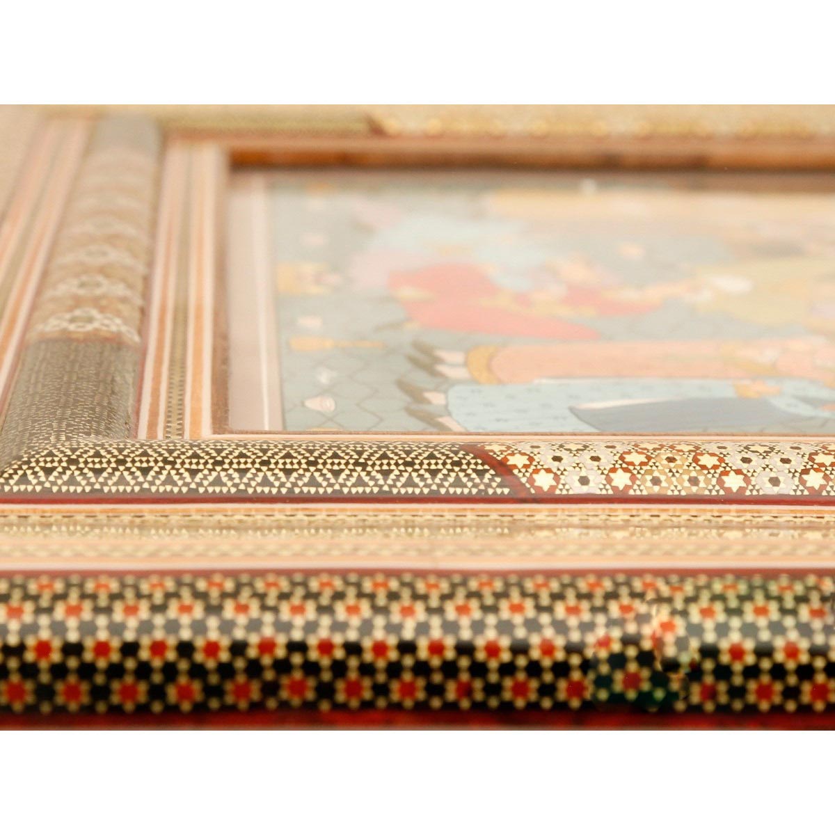 This miniature painting shows the Persian banquet of food & wine handpainted w shiny colors for live feeling on the wall. The painting is framed with premium quality Khatamkari with 5 different geometrical patterns.