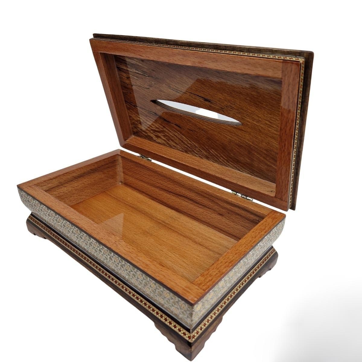 Elevate the look of your dining table with this exquisite handmade wooden tissue box adorned with stunning multicolored Persian Khatam Marquetry. Crafted with the highest quality materials and designed to impress, this tissue box is both functional and beautiful. Its intricate details and luxurious craftsmanship make it a statement piece that will add elegance and sophistication to any dining table. Keep your tissues organized and within reach in this high-quality tissue box that is sure to make a lasting impression on your guests.